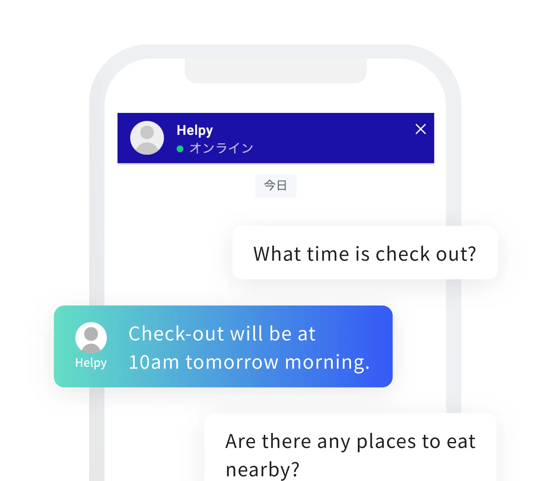 Helpy(ヘルピー)は、お客様自身のスマートフォンやタブレットで利用できる、多言語対応のAIチャット&施設ガイドサービスです。